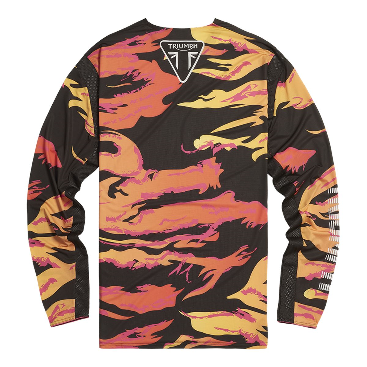 Aus innovativem, ultraleichtem und elastischem Polyester Netzgewebe mit einem geformten Rückenteil für eine sichere und komfortable Passform. Stilisierter, sublimierter ?Tiger Stripe?-Druck mit Triumph Motorcycles-Schriftzug in Pink und Weiß im Brustbereich und an den Ärmeln.